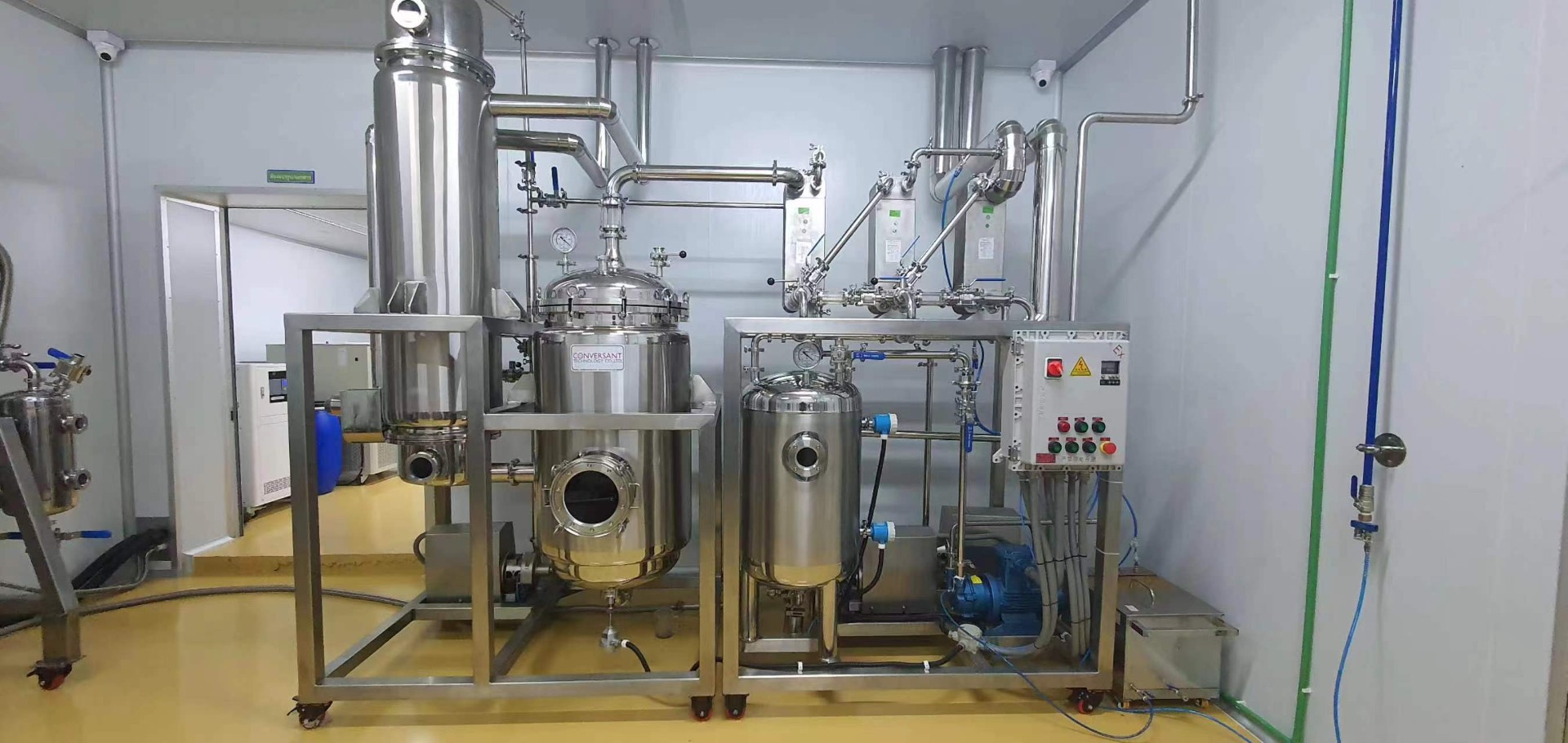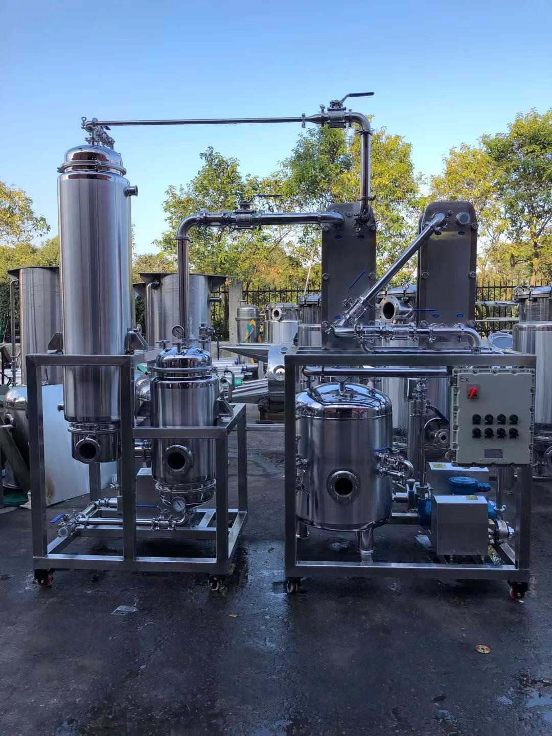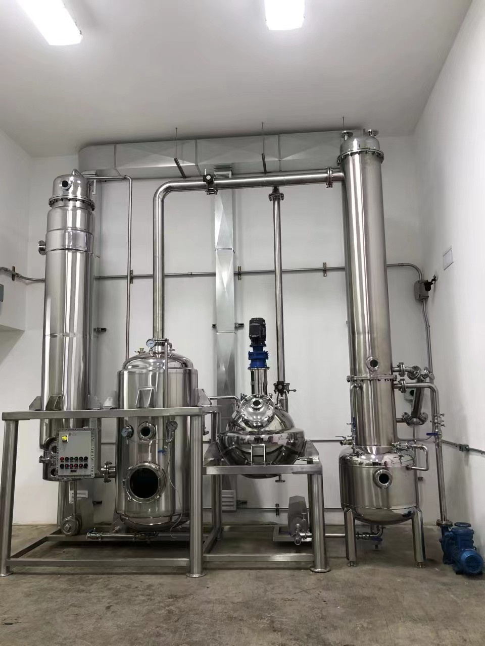 系統組成: 各效蒸發器、各效分離器、冷凝器、熱壓泵、真空泵、各效料液輸送泵、冷凝水泵、操作平臺、電器控制柜、液位自控系統及閥門管路等。